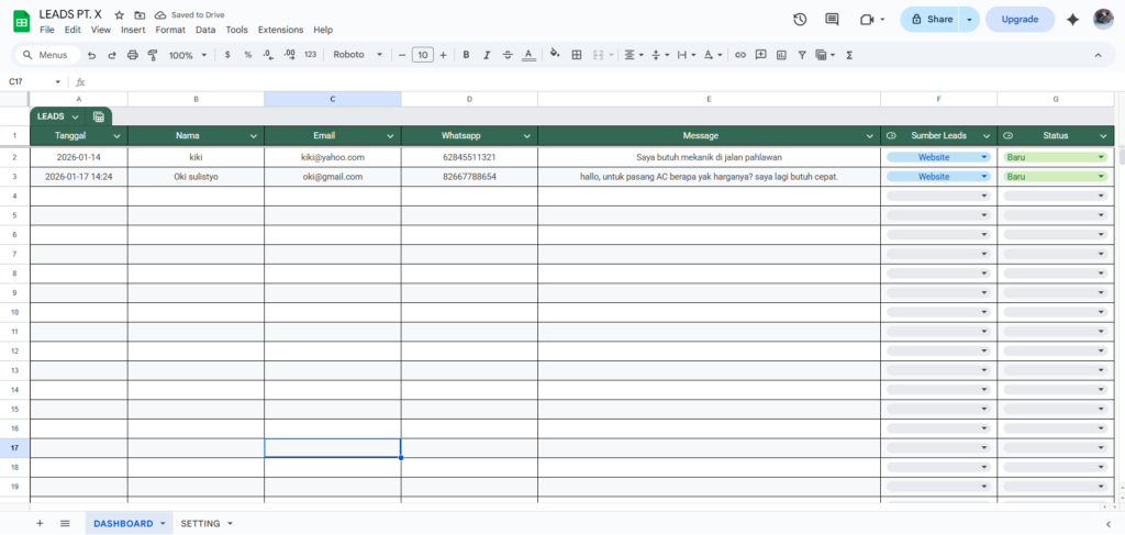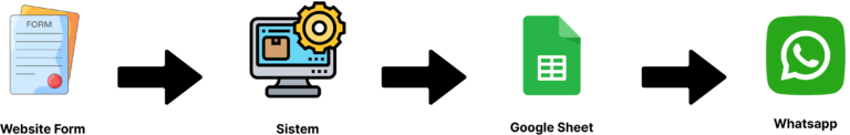 Secara garis besar, sistem ini bekerja dengan alur yang sangat sederhana. Ketika calon pelanggan mengisi form di website, data tersebut langsung diproses dan dicatat ke dalam satu dashboard. Pada saat yang sama, pemilik bisnis menerima notifikasi WhatsApp sebagai tanda bahwa ada lead baru yang masuk. Alur ini membantu memastikan bahwa setiap calon pelanggan tercatat dan tidak terlewat, sekaligus memungkinkan respon dilakukan lebih cepat dan konsisten.